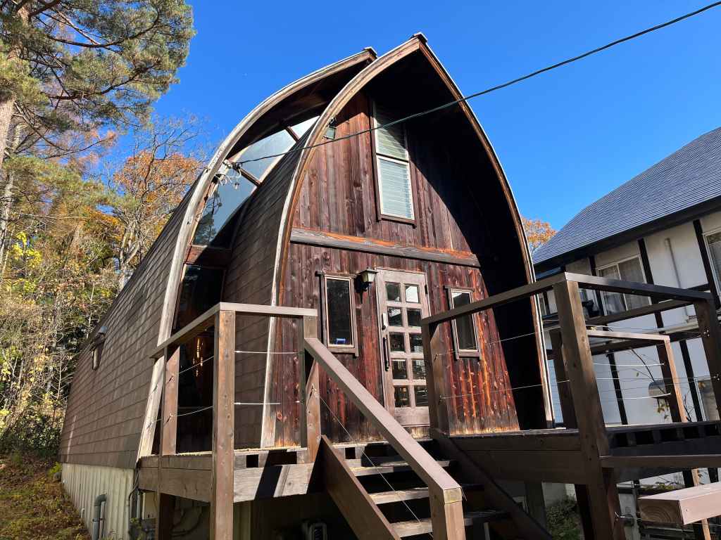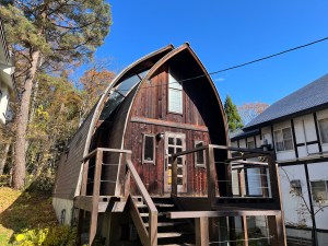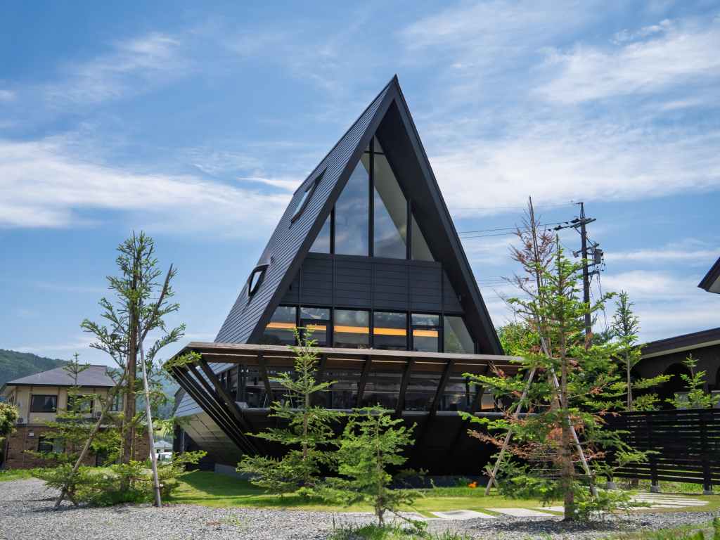 The house stands out for its uniqueness, and it is shaped like the letter “A” of the alphabet. Located in the middle of Hakuba Station and Happo Bus Terminal!